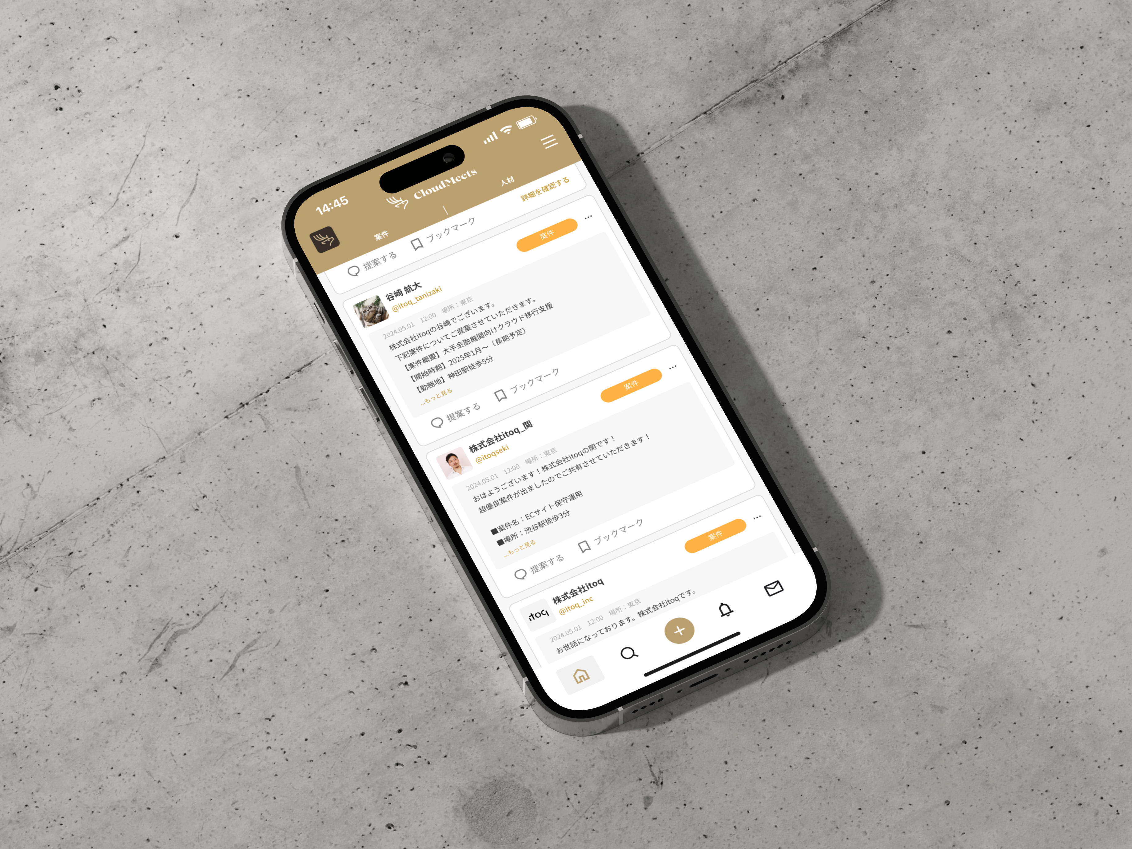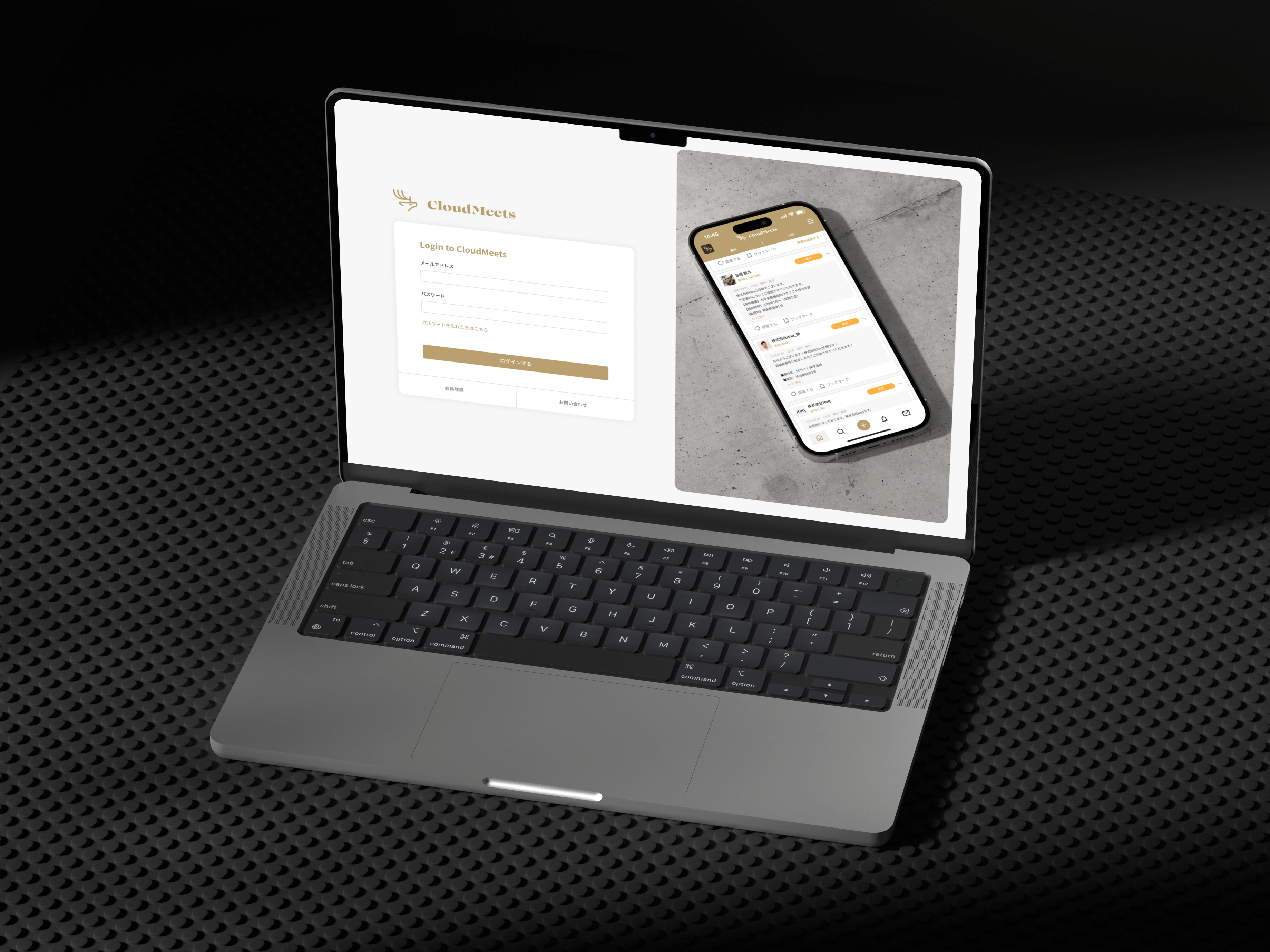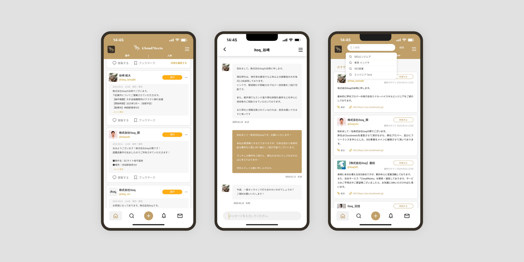 SESマッチングプラットフォーム「CloudMeets」のリニューアルを担当。要件定義・機能定義の段階から携わり、システム刷新に合わせてユーザー体験の再設計とロゴリニューアルを行った。移り変わりの速いSES業界において、改善を重ね成長を続ける姿勢を表現するため、凛とした佇まいと毎年ツノが生え変わる鹿をモチーフに採用。誰でも扱いやすく、使っていて気分がいいプロダクトを目指し、ゴールドベージュをブランドカラーに据えた落ち着きと品のあるUIを構築した。